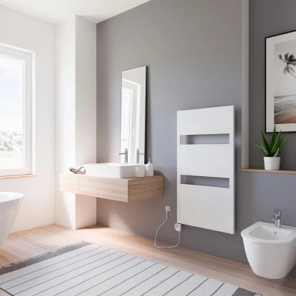 Der steckerfertige Schulte Badheizkörper Turin mit Heizstab kennzeichnet sich durch seine beinahe vollflächige Front, die nur durch einige Ausschnitte unterbrochen wird. In diesen können Sie wunderbar Ihre Handtücher aufhängen – egal, ob zum Trocknen nach oder zum Aufwärmen vor dem Gebrauch. Diese ausgefeilte Optik geht mit einer starken, zuverlässigen Wärmeleistung einher, welche Ihre Räumlichkeiten langfristig und zufriedenstellend heizen wird.
