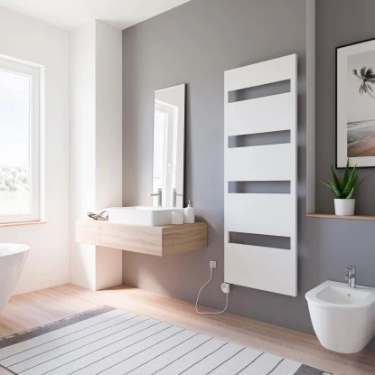 Der steckerfertige Schulte Badheizkörper Turin mit Heizstab kennzeichnet sich durch seine beinahe vollflächige Front, die nur durch einige Ausschnitte unterbrochen wird. In diesen können Sie wunderbar Ihre Handtücher aufhängen – egal, ob zum Trocknen nach oder zum Aufwärmen vor dem Gebrauch. Diese ausgefeilte Optik geht mit einer starken, zuverlässigen Wärmeleistung einher, welche Ihre Räumlichkeiten langfristig und zufriedenstellend heizen wird.