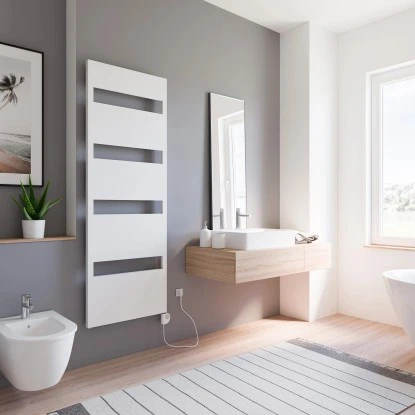 Der steckerfertige Schulte Badheizkörper Turin mit Heizstab kennzeichnet sich durch seine beinahe vollflächige Front, die nur durch einige Ausschnitte unterbrochen wird. In diesen können Sie wunderbar Ihre Handtücher aufhängen – egal, ob zum Trocknen nach oder zum Aufwärmen vor dem Gebrauch. Diese ausgefeilte Optik geht mit einer starken, zuverlässigen Wärmeleistung einher, welche Ihre Räumlichkeiten langfristig und zufriedenstellend heizen wird.