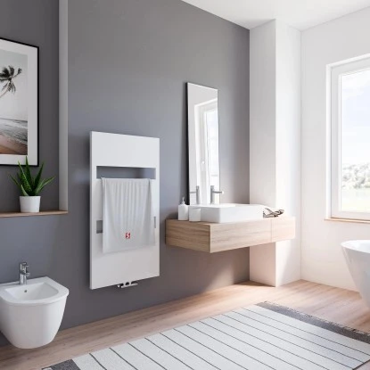 Der Schulte Design-Heizkörper Turin in Alpinweiß kennzeichnet sich durch seine beinahe vollflächige Front, die nur durch einige Ausschnitte unterbrochen wird. In diesen können Sie wunderbar Ihre Handtücher aufhängen- egal, ob zum Trocknen nach oder zum Aufwärmen vor dem Gebrauch. Diese ausgefeilte Optik geht mit einer starken, zuverlässigen Heizleistung einher, welche Ihre Räumlichkeiten langfristig und zufriedenstellend heizen wird.