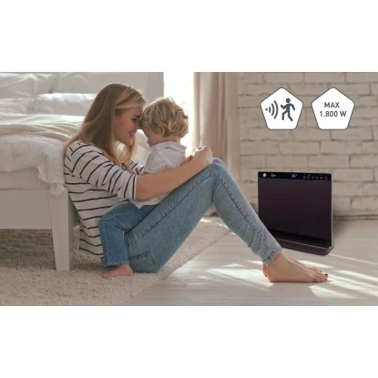 Er sorgt für schnelle, leise und nachhaltige Wärme durch Keramiksteine auf 2 Stufen (900/1.800 W). Der Suntec Heat Screen 1800 verfügt über eine automatische Temperaturregulierung, einem Ausschalttimer, einem Bewegungssensor mit 2 m Radius, sowie einem Fenstersensor, der das Gerät abschaltet, wenn innerhalb von 30 Min. die Temperatur um -10 °C abfällt. Um für die notwendige Sicherheit zu sorgen ist das Gerät mit einem mechanischen Kippschutz, einer Kindersicherung (Lockfunktion) und einem thermischen Überhitzungsschutz ausgestattet. Die Navigation des Geräts erfolgt über das LED-Touch-Display. Mit den verschiedenen Möglichkeiten zur automatischen Steuerung und der handlichen Fernbedienung ist er zudem sehr komfortabel.